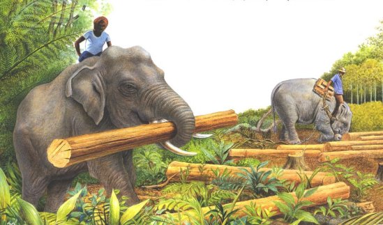 ELS ELEFANTS PODEN VIURE AMB LES PERSONES I FER ALGUNES FEINES SI SE'LS DOMESTICA. EN ALGUNS PAÏSOS ELS FAN SERVIR PER TREBALLAR. FAN SERVIR LA SEVA FORÇA PER A TRANSPORTAR TRONCS O PERSONES D'UN LLOC A UN ALTRE.