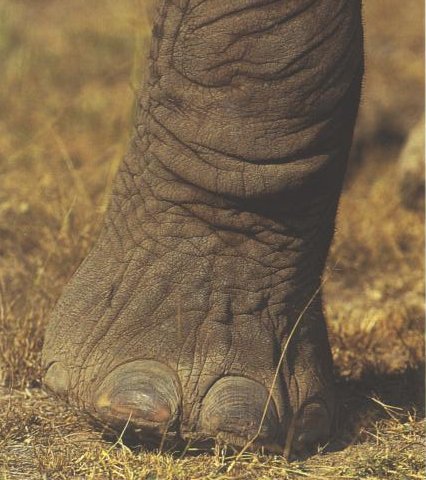 L'ELEFANT TÉ 4 POTES MOLT GRUIXUDES. CADA POTA DEL DAVANT TÉ 5 UNGLES, I A LES DEL DARRERE, L'ELEFANT AFRICÀ EN TÉ 3 I L'ASIÀTIC EN TÉ 4.