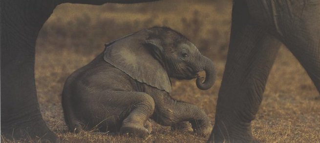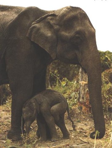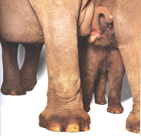 PASSATS UNA HORA, LA CRIA JA ES POT FICAR DE PEUS I S'ACURRUCA AL COSTAT DE LA SEVA MARE PER PODER BEURE UNA MICA DE LLET DE LES DUES GLÀNDULES MAMÀRIES. NO SAP FER SERVIR LA TROMPA, I FINS I TOT SE LA TREPITJA. VA APRENENT A FER-LA ANAR IMITANT ALS ADULTS.