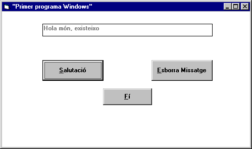 Executar el programa m1p1.exe per conèixer el seu comportament. Cliqueu si no funciona correctament Veure el llistat del codi del programa, m1p1. Executar Visual Basic per editar el projecte (acabat): m1p1.vbp. Cliqueu si no funciona correctament Un primer contacte amb el Visual BasicAquest primer projecte consisteix en crear una finestra en la qual hi haurà tres botons. En clicar cada un d’ells es realitza una de les tasques següents:
