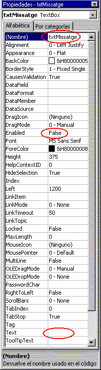 ![]() Ja s’ha dit anteriorment que la propietat (Nombre) és fonamental per fer referència a un objecte en el codi d’un programa. Pel que fa a les altres dues propietats noves, la propietat Text serveix per emmagatzemar el contingut textual de la caixa i la propietat Enabled s’utilitza per permetre la interacció de l’usuari a la caixa de text (en aquest cas, no es permet la interacció perquè Enabled té el valor False). Creeu els tres botons de comandament, activant la icona de la caixa d’eines i