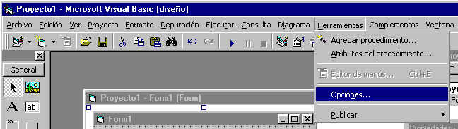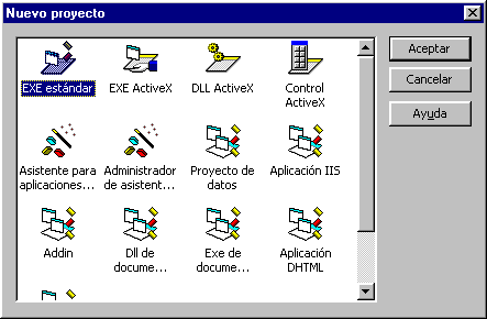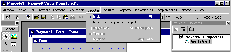 ![]() Carregueu el Visual Basic i observeu les diferents finestres que componen l’entorn de treball. Si teniu com a fons la finestra de l'administrador del Windows és millor que la minimitzeu. Per tal que Visual Basic demani la declaració de constants i variables (dades a manipular) en el codi que intervé en el programa, cal que activeu l’opció Opciones... del menú Herramientas. Us apareix un check box que heu d'activar a la fila Requerir declaración de variables. És recomanable que ho feu en tots els projectes. ![]() ![]() Activeu l’opció Nuevo Proyecto del menú Archivo per crear un nou projecte. Observeu l’aparició automàtica d’un formulari (formulari principal) en blanc. ![]() Apareix un nou quadre de diàleg on podem escollir diferents tipus de projectes i ens quedarem amb el que se'ns ofereix per defecte, EXE estándar. O sigui que prémerem RETURN. ![]() Creeu un subdirectori nou: C:\VBCurs\VBActivi\m1\p1 que servirà per guardar tots els fitxers del projecte. Fase de disseny de la interfície d’usuariFeu més petit el formulari anterior per tal de veure les finestres de projecte i de propietats i apliqueu al formulari les propietats següents, activant la icona de la
