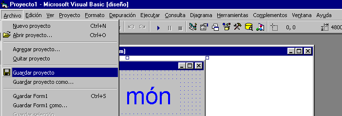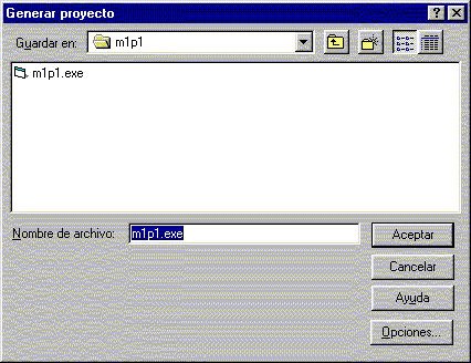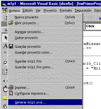 és a dir, Nomobjecte.PropietatAEstablir=Valor de la propietat de l’objecte Nota: per tal de fer més llegible el codi de programa, és recomanable que el començament del nom dels objectes indiqui el tipus d’objecte. Per exemple, a l’activitat anterior el formulari principal s’anomena frmPrimerPrograma (prefix frm), la caixa de text (prefix txt) s’anomena txtMissatge i els tres botons definits a l’activitat s’anomenen cmdSalutació, cmdFi i cmdEsborrar (cmd és el prefix utilitzat). Cliqueu aquí, hi ha un annex que especifica una proposta de prefixos per als objectes que intervenen en un projecte de Visual Basic. Executeu el programa mitjançant l'ordre Start del menú Run i observeu els resultats. ![]() En acabar el programa es retorna el control al Visual Basic. Deseu el projecte en el directori C:\VBCurs\VBActivi\m1\p1 que haureu creat anteriorment. Per això, cal que activeu l'opció Guardar proyecto como del menú Archivo. Observeu que cal introduir el nom del fitxer de formulari m1p1 (m1p1.frm) i el nom del projecte m1p1 (m1p1.vbp "mòdul 1, pràctica 1"). L'extensió del formulari és per defecte .frm i del projecte .vbp. No és bo que la canvieu o sigui que no hi poseu l'extensió, Visual Basic ja les col·loca automàticament si no n'hi poseu. ![]() Sortiu de l’entorn del Visual Basic i observeu el que hi ha al directori de treball escollit. ![]() A continuació us apareixerà un quadre de diàleg estandard on hi haureu d'escriure el nom. Visual Basic us suggereix el del nom del projecte acabat amb exe, el podeu canviar, però no és convenient fer-ho. ![]() Un cop fet això ja teniu un executable independent, el podeu executar sense necessitat de carregar l'entorn de Visual Basic, simplement clicant el seu nom, per exemple desde l'administrador d'arxius de Windows. Si el voleu distribuir, cal tenir en compte que els executables de Visual basic 6.0 necessiten com a mínim una llibreria, el Run Time (una Dll), que Visual Basic instal.la en el directori System del Windows. És una llibreria que es pot distribuir lliurement, a la majoria d'ordinadors acostuma a ser-hi, ja que ve adjunta a molts programes. Si es fa servir una altra versió de Visual Basic, doncs s'haurà de distribuir amb la seva llibreria. Si a més al programa hi posem controls vbx aquestos també hauran d'anar inclosos en la distribució, sinó el programa no funcionará en el nou ordinador. ExercicisObserveu:1.- Les propietats dels formularis, les possibles dades que podeu posar-hi i el seu efecte: BackColor, Enabled, Visible.