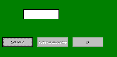 2- BorderStyle: None. 3- Botó salutació FontBold: False. 4- Botó Esborra Missatge FontItalic: true. 5- Botó Esborra Missatge Enabled: false. 6- Botó Fi FontName: Tymes New Roman. ![]()