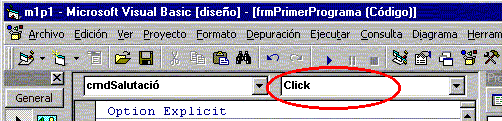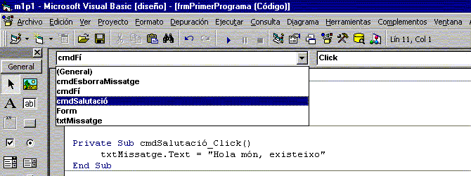 Nota: Com que suposem que a aquestes alçades ja se sap canviar les propietats en el formulari Properties ja no posem el dibuix de com quedaria un cop canviat. Els botons de comandament tenen la propietat Caption amb el valor &Salutació, &EsborraMissatge i &Fi perquè el símbol & davant una lletra fa que aparegui subratllada després i que el procediment associat a l'event Click del botó corresponent s'executi també amb la combinació de tecles Alt+Lletra. Per exemple, prémer la combinació de tecles Alt+S és equivalent a clicar el botó Salutació. Fase de programació de respostes a eventsHeu dissenyat la interfície de pantalla per a l'usuari. Cal que afegiu el codi de programa que faci possible que en clicar un dels botons creats “passi alguna cosa”. Si premeu dues vegades (doble clic) sobre el botó Salutació, apareix la finestra d'edició de codi associada al formulari. Aquesta finestra conté, a la part superior, una subfinestra per escollir un dels objectes que conté. En aquest cas, el botó cmdSalutació.![]()
