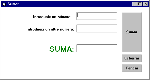 valors dels sumands i del total de la suma.Els tres botons de comandament serveixen per: presentar la suma, esborrar els valors entrats i finalitzar l'execució del programa. Establiu els objectes i les seves propietats: