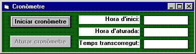 Executar el programa m1p4.exe per conèixer el seu comportament. Cliqueu si no funciona correctament Veure el llistat del codi del programa, m1p4. Executar Visual Basic per editar el projecte (acabat): m1p4.vbp. Cliqueu si no funciona correctament CronòmetreEn aquesta activitat es mostra una finestra que marca el temps transcorregut entre dos instants donats de temps i marcats per l'usuari. L'usuari disposa de dos botons: un per indicar el moment de començament del període de temps i un altre per marcar la finalització d'aquest període de temps.Per altra banda, hi ha tres controls per mostrar els temps, inicial i final, escollits per l'usuari i la seva diferència: el temps transcorregut: ![]() Fase de disseny de la interfície d’usuariEls botons de comandament d'Inici i Aturada estaran actius (enabled) de forma alternativa i els controls de text solament presenten informació a l'usuari.Creeu un directori nou: C:\VBCurs\VBActivi\m1\p4 i un nou projecte, en aquest directori, que anomenareu m1p4. En ell, desareu tots els fitxers d'aquesta activitat. Les propietats dels objectes són: