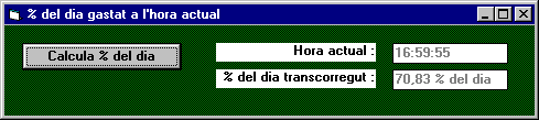 Fitxer formulari m1p4e1.frm Fitxer executable m1p4e1.exe E2. Creeu un formulari on aparegui l'hora actual i mostri, en tant per cent, la part de dia transcorreguda. Un dia té 86400 segons. La finestra principal del programa ha de quedar més o menys així: ![]() Cal enviar els següents fitxers: