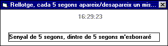 Aquest procediment s'executa cada 100 milisegons perquè la propietat Interval de l'objecte Timer té aquest valor. Llegeix l'hora del sistema i l'assigna a la caixa de text txtHora. Finalment, deseu el projecte amb el nom m2p3. ExercicisPer enviar al professor tutor. (Directori C:\VBCurs\VBExerci\m2\p3 )E1. Feu que el rellotge anterior mostri cada 5 segons un missatge per pantalla, al cap de 5 segons desapareix, al cap de 5 segons més apareix, de nou, al cap de 5 segons més torna a aparèixer i així succesivament. Recordeu la instrucció Second. Pot servir-vos d'ajuda la següent instrucció del Basic: La finestra principal del programa ha de quedar més o menys així: ![]() Cal enviar els següents fitxers: