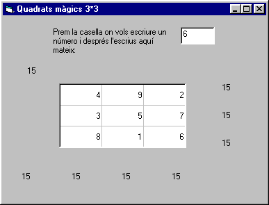 Quan acabeu de preparar el programa podeu fer el següent quadrat màgic: ![]() Ha de quedar una cosa així: ![]() ExercicisNo n'hi ha. |
