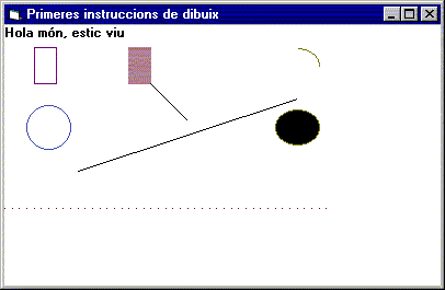 Observeu que en aquest procediment es defineix una variable Pi que correspon al número p = 3.1416. Per assignar-li valor feu ús de la funció matemàtica Atn (arc tangent) en la instrucció: Pi=4*Atan(1). Les propietats CurrentX i CurrentY defineixen el punt en el qual us voleu situar inicialment. Aquest lloc es pot utilitzar, per exemple, per començar a escriure la funció Print. Observeu també els tres usos de la funció Line que apareix en el programa i que permeten fer línies i rectangles de diferents colors, buits o omplerts. Aquesta funció canvia els valors de les propietats CurrentX i CurrentY posant-los les coordenades del segon punt. Podeu fer ús de la funció Line ometent el primer punt. Llavors el primer punt és, per defecte, el que indiquen les propietats anteriors: (CurrentX,CurrentY). Per exemple, Line -(4000, 3000) o Line -(4000, 3000), QBColor(5), B. Per dibuixar cercles, el·lipses i arcs i sectors heu de fer servir el mètode circle. Els paràmetres d'aquest mètode són els que defineixen les distintes formes. Per definir el color d'una figura circle cal que utilitzeu les propietats FillStyle i FillColor. En darrer lloc, el mètode Pset dibuixa un punt en les coordenades que se li passen com a paràmetres en el color desitjat. Mètodes associats a l'event DblClick El mètode Cls esborra tot els dibuixos fets amb els mètodes de dibuix anteriors. Sub Form_DblClick () Cls End Sub ExercicisPer enviar al professor tutor. (Directori C:\VBCurs\VBExerci\m6\p1 )E1. Fer un projecte nou que quan es cliqui damunt de la finestra surti un dibuix semblant al de sota. Quan es faci doble clic s'esborri la finestra. Els mètodes que heu de codificar són els mateixos que a la pràctica. ![]() Cal enviar els següents fitxers:
