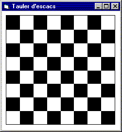 Fitxer formulari m6p2e1.frm Fitxer executable m6p2e1.exe E2. La figura següent és un tauler d'escacs. Heu de preparar una escala en la qual l'origen sigui, igual que a l'exercici 1, el vèrtex inferior esquerra. El quadrat de dibuix tindrà 8 x 8 unitats. Ara heu de fer files de rectangles, amb el mètode Line i el paràmetre BF. Podeu fer servir la instrucció For... next.... ![]() Cal enviar els següents fitxers: