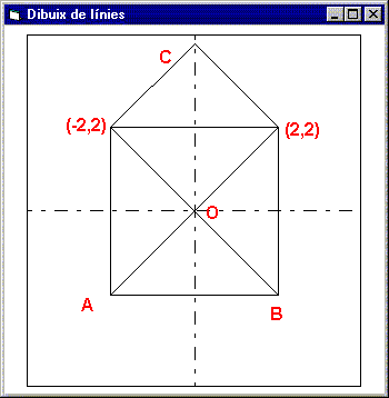 picDibuix.Fase de programació de respostes a eventsDefinició i declaració de variables d'àmbit tot el formulari:Dim VèrtexAX As Single Dim VèrtexAY As Single Dim VèrtexBx As Single Dim VèrtexBY As Single Procediments d'àmbit tot el formulari: Procediment d'àmbit tot el formulari que crearà un sistema d'eixos de coordenades centrat i en centímetres en el quadre de dibuix picDibuix: Sub PosaEscala () Dim MidaX As Single Dim MidaY As Single Dim ConversióTwipsCentímetres As Single ConversióTwipsCentímetres = 1 / 567 MidaX = picDibuix.Width * ConversióTwipsCentímetres MidaY = picDibuix.Height * ConversióTwipsCentímetres VèrtexAX = -MidaX / 2 VèrtexAY = MidaY / 2 VèrtexBx = MidaX / 2 VèrtexBY = -MidaY / 2 picDibuix.Scale (VèrtexAX, VèrtexAY)-(VèrtexBx, VèrtexBY) End Sub Mètodes associats a l'event Load Per al formulari: En obrir-se el formulari principal s'executa el procediment PosaEscala. Sub Form_Load () PosaEscala End Sub Mètodes associats a l'event Click El dibuix apareixerà en l'objecte picDibuix com a resposta de l'event Click. Aquí cal posar l'algorisme explicat abans per tal de fer el dibuix de línies: Sub picDibuix_Click () ' Posar el llapis al vèrtex A(-2,-2). picDibuix.CurrentX = -2 picDibuix.CurrentY = -2 ' Dibuixar una línia fins al punt B(2,-2). picDibuix.Line -(2, -2) 'Dibuixar una línia fins al punt (2,2). picDibuix.Line -(2, 2) picDibuix.Line -(-2, 2) picDibuix.Line -(0, 4) picDibuix.Line -(2, 2) picDibuix.Line -(-2, -2) picDibuix.Line -(-2, 2) picDibuix.Line -(2, -2) End Sub ExercicisNo n'hi ha |