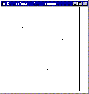 Si voleu que la paràbola es dibuixi en un traç heu d'unir els punts anteriors per tal de fer una línia continua. El procediment anterior l'heu de modificar de la forma següent: ![]() Dibuix de la paràbola amb traç continu: Sub picDibuix_Click ()