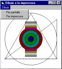 Definiu també la variable global al formulari: Const IDYES=6 aquest valor de la variable és el que retorna la funció MsgBox quan es prem el botó d'acceptació. Heu de tenir cura de demanar confirmació abans d'imprimir el formulari. Aquesta forma d'imprimir fa un bolcat de mapa de bits del formulari cap a la impressora. b) Imprimir en l'objecte Printer A efectes de dibuixar, l'objecte Printer és molt semblant als objectes formulari i quadre de dibuix, de manera que té quasi bé els mateixos mčtodes i propietats que aquests. A més disposa dels mčtodes propis EndDoc i NewPage. Com que dibuixar en un formulari és igual que fer el dibuix en l'objecte printer, és convenient fer primer el dibuix a sobre d'un formulari, i fer les proves necessŕries fins que el programa funcioni bé. Després el podeu posar dins de l'objecte Printer afegint les instruccions adients de EndDoc i NewPage. Fareu un programa amb dues opcions de menú, que faran el mateix dibuix en el formulari i en l'objecte printer. El formulari esmentat se semblarŕ al mostrat a sota. ![]() Fase de disseny de la interfície d’usuariCreeu un formulari nou al qual li afegireu un menú, anomenat Dibuix i amb dues opcions: Per pantalla i Per impressora. El projecte el desareu amb el nom m6p7 i en el directori C:\VBCurs\VBActivi\m6\p7. Les propietats dels objectes són:
