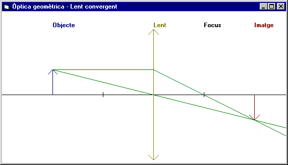Executar el programa m7p1.exe per conèixer el seu comportament. Veure el llistat del codi del programa, m7p1. Executar Visual Basic per editar el projecte (acabat): m7p1.vbp. Simulació d'una lent convergent. Com dibuixar? FotografiaEn un llibre de física de segon de BUP s'explica com va el traçat de feixos de llum a través d'una lent convergent. El que pretenem aquí és fer el dibuix que apareix en aquests llibres. La pràctica és molt semblant a les del mòdul 5.El dibuix que pretenem aconseguir és el següent: ![]() Aquest projecte el desareu a C:\VBCurs\VBActivi\m7\p1 amb el nom m7p1. Fase de disseny de la interfície d’usuariHem de fer un formulari més o menys de la mida del dibuix anterior. Aquí no hi col·loquem cap objecte, la seva aparença la crearem en temps d'execució mitjançant el procediment pintar.Important: la propietat del formulari Scale mode l'heu de posar en 3 - Pixel. Fase de programació de respostes a eventsEl funcionament del programa és el següent: quan es carrega el formulari, event Form_Load() crida a un procediment Iniciar() que s'encarrega d'iniciar les variables que definirem a nivell d'àmbit global del projecte.Fins ara quan voliem fer un dibuix (mòdul 5) calia clicar en el formulari o en un menú, és a dir, calia activar un event. Aquí farem servir l'event Form_Paint que és un event que crida el sistema operatiu cada vegada que calgui repintar la finestra. Per la qual cosa el dibuix es veurà sempre que veiem la finestra. L'event Form_Paint crida senzillament el procediment Pintar que és el que realment cuida de fer aparèixer el dibuix. Variables d'àmbit a tot el formulari Dim yT, xL, xO, yO, F, xI, yI As IntegerAquestes variables serveixen per definir les posicions dels objectes en la finestra. Així yT, vol dir Coordenada y del Terra i xL, coordenada x de la Lent... Els comentaris (REM ') us ajudaran en la comprensió del significat de les variables. Procediments d'àmbit a tot el formulari Per iniciar les variables tenim el següent procediment: Sub iniciar () yT = 165 xL = 300 xO = 100 yO = 50 F = 100 End Sub El procediment (mètode) Pintar és el que fa el dibuix. Observeu les diferents instruccions que ens ofereix el Visual Basic per opcions gràfiques: Cls, Print, ForeColor i QBColor. Sub Pintar ()