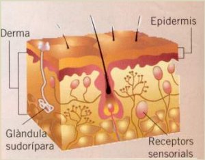 La pell és l'òrgan del sentit del tacte. Està formada per dues capes: l'exterior o epidermis i la interior o derma. A la derma hi ha les glàndules sudorípares i els receptors sensorials de la pressió i la temperatura. La informació que capta és enviada, a través dels nervis, a la medul·la espinal i a l'encèfal.