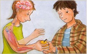 La visió d'una fruita ens fa allargar la mà per agafar-la. L'ull envia la informació a l'encèfal i aquest ordena als músculs del braç d'agafar-la. Es tracta d'un moviment voluntari, ja que el realitzem conscientment. Els moviments voluntaris són ordenats directament per l'encèfal. |
