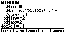 Si utilizamos la calculadora gráfica TI-86 para ver la gráfica de las ecuaciones paramétrcas anteriores, tenemos inicialmente que poner la calculadora en el modo angular de radianes he indicar que estamos trabajando con ecuaciones paramétricas. Esto es así debido a que estamos trabajando con funciones trigonométricas. Para esto entre ha MODE.