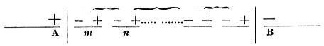 Ahora bien, en la hipótesis de dos electricidades, éstas se acumulan en los dos polos, que simbólicamente representaremos por (+ A) y (— B) (fig. 407) y el conductor intermedio por las trazas m, n,... etc. Las electricidades se acumularían, según se indica, viniendo la positiva de la molécula próxima al polo negativo (— B) á neutralizar la del mismo, así como la negativa del extremo opuesto se dirige hacia el polo positivo (+ A). En el momento en que esto se verifica hay neutralización de las electricidades entre cada dos moléculas sucesivas, conforme indican las llaves, y volvería á reproducirse una nueva polarización eléctrica, que da en último resultado origen á dos corrientes, una de electricidad negativa dirigida al polo positivo, y otra contraria hacia el polo negativo.