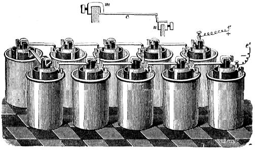 Dispónese en cada elemento (fig. 411), primero el tarro de porcelana ó de vidrio que contiene el agua acidulada en donde se sumerge la lámina de zinc encorvada en cilindro: dentro de éste se halla luego el vaso poroso con el ácido nítrico que baña el prisma de carbón. Los elementos, que tienen 1,8 voltios de fuerza electromotriz se unen entre si por láminas de cobre, según indica el grabado, que representa una pila de diez pares cargada en tensión; es decir, unido cada carbón con el zinc del par siguiente, empleando para sujetar las tiras de enlace unas piezas de bronce, ó pinzas de tornillo, n, m.