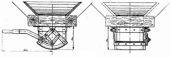 En la figura 99 la distancia de transporte es 7,7 m. ; el ancho del carretón alcanza 2,8 m. Cuando las distancias de transporte son de más de 100 m., conviene descargar en silos o tolvas, provistas de bocas de descarga del tipo de las representadas en las figuras 102 y 103, y descargar estas tolvas en vagonetas.