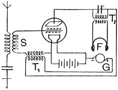 La válvula de tres electrodos puede emplearse también como detector, además de su aplicación como generador de corrientes alternas de amplitud constante. Al esquema de la figura 58 donde se emplea como tal, corresponde el de la figura 89, donde se emplea como receptor. (Sistema de Arco y Meissner). El funcionamiento es sumamente sencillo: las oscilaciones inducidas por la antena en el secundario S hacen que el potencial en la parrilla sea alternativamente positivo o negativo. Cuando es positivo se cierra el circuito del generador G a través de la válvula y cuando es negativo, se interrumpe esta corriente; estas pulsaciones, reaccionando mediante el transformador T1 sobre el primer circuito, elevan a un máximo las variaciones del potencial. Las oscilaciones, son recogidas en el teléfono F por medio del transformador T2. Como se ve, este sistema se presta tanto a la recepción telegráfica como a la telefónica.