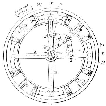 Consiste en un toro circular, en el interior del cual hay cuatro pares de émbolos fijos en los extremos de dos palancas articuladas por su centro en el eje del motor. Dichas palancas (fig. 326) tienen un movimiento de tijera, gracias a las explosiones que se producen entre los émbolos, el cual se transforma en circular por medio de las palancas b' y b'', articuladas en el punto d, y la biela H.