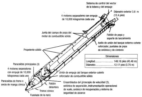 Los primeros en salir son los cohetes reforzadores de combustible sólido (véase la figura 9.2). Con una longitud de 45 metros desde la tobera hasta la nariz y 3.65 metros de diámetro, los cohetes reforzadores están unidos cerca de sus extremos al tanque exterior, que es ligeramente más alto y tiene el doble de grueso, el cual a su vez está unido al orbitador. Un cohete reforzador para transbordador es el cohete de combustible sólido más grande que jamás haya volado, el primero que se construyó para usarse en una nave espacial tripulada y el primero diseñado para reutilizarse. Se ensambla con segmentos sin costura de acero de media pulgada, revestidos con aislante pesado, que se llenan con un propulsante en el sitio de fabricación en Utah, y que se transportan en carros plataforma de ferrocarril a Kennedy para su ensamblado o, para los vuelos de sur a norte, a la base Vandenberg de la Fuerza Aérea al norte de Los Ángeles.Figura 9.2 El lanzamiento del transbordador espacial. (Fuente: Referencia 3.)