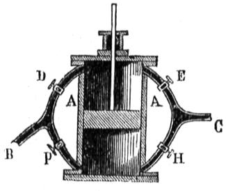 Supongamos (fig, 292) un cilindro A abierto por la parte superior, y que comunica con una caldera de vapor desde su parte inferior por medio del tubo B, y con el esterior por medio del D; supongamos cerrado este tubo D y abierto el B; el vapor llega al cilindro y su fuerza elástica vence la resistencia que le opone el piston C y le hace subir: cuando ha llegado a la parte superior, supongamos que se cierra el tubo B y se abre el D; él vapor que se encontrará oprimido por el peso del pistón C saldrá por D, y este piston C bajará; cerrando de nuevo D y abriendo B asciende C otra vez y de este modo continuará con un movimiento alternativo, que se comunicaria por medio de diferentes piezas á donde sea necesario. El mismo efecto se produciria si el cilindro estuviera cerrado solo por la parte superior y entrara el vapor en ella haciendo bajar el pistón, para que después una fuerza cualquiera le hiciera subir. Este es el principio en que están fundadas las máquinas llamadas de simple efecto, en las que, como se ve, el vapor obra solo en un lado del piston.