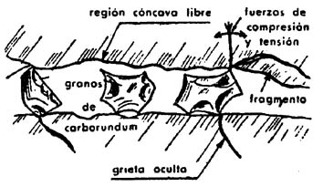 1 Un trozo de vidrio frotado contra otro con la interposición de Carborundum 280 ó 400.