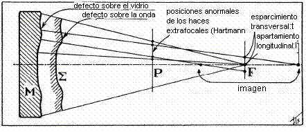 El control de los paraboloides en la misma disposición que tiene su uso regular, impone serias dificultades puesto que habría que alejar considerablemente la fuente de luz, o disponer de un plano patrón a autocolimación o de un colimador perfecto del mismo diámetro que el espejo ; pero a estas soluciones, aun los profesionales solo pueden recurrir en raras ocasiones. Se trabaja pues en el centro de curvatura ; Sabemos que, en estas condiciones únicamente un espejo esférico dará una imagen perfecta ; con el paraboloide aparece un defecto bien visible, inverso del presentado en el foco del esférico, que es un aspecto de la aberración esférica. Se puede prever anticipadamente la magnitud de este defecto, que se calculará por ejemplo, en el sentido longitudinal, cuya medida es más fácil ; bastará luego restar este valor de la aberración real, observada en el espejo estudiado, para obtener los residuos que representan los defectos propios del espejo y que un simple cálculo reducirá al plano focal, con el fin de poder apreciar directamente el grado de importancia que tendrá en relación con la figura de difracción perfecta.