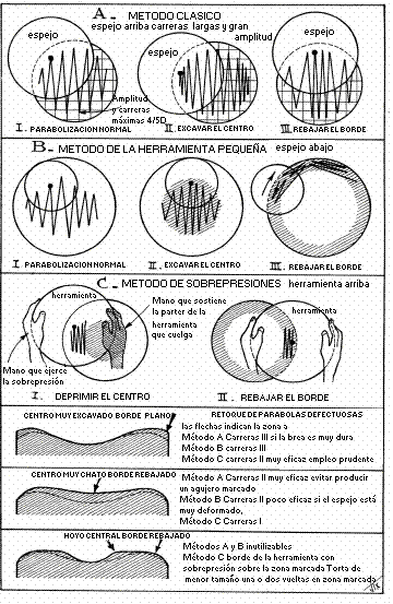 B) Método de la herramienta pequeña (figura 42B). Con un espejo un poco grande y no muy abierto, puede dar buenos resultados el empleo de una torta de la mitad del diámetro del espejo. El método es especialmente interesante para perfeccionar una forma obtenida con una herramienta grande ; si la duración del trabajo de la herramienta pequeña debe prolongarse mucho, existirá el peligro de que se produzcan ondulaciones y rayas.