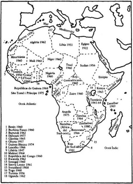 - Expliqueu els factors que van influir en el procés de descolonització africana. Diferencieu les etapes d’emancipació i comenteu les diferències en els ritmes i en els continguts de les negociacions amb les metròpolis, segons que fossin colònies britàniques o franceses. [2 punts]