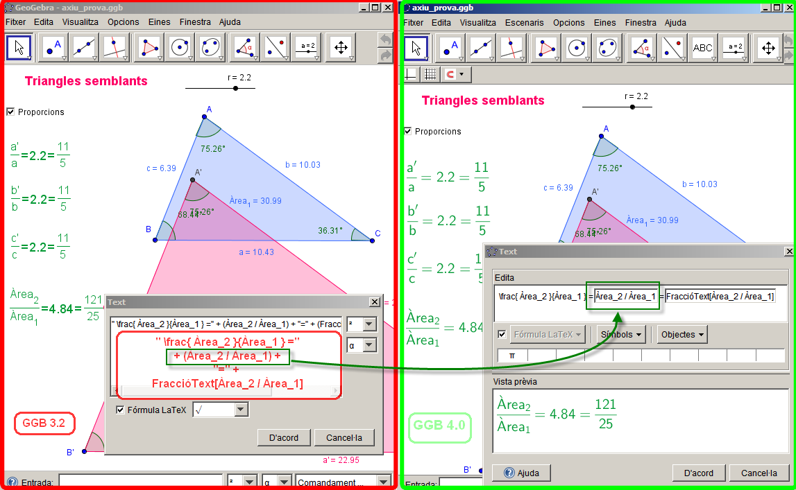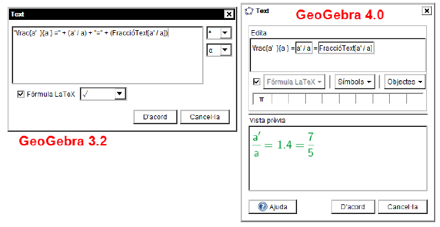 i comparem amb els canvis que representen els textos dinàmics entre la versió 3.2.47 i la versió 4.0 del GeoGebra