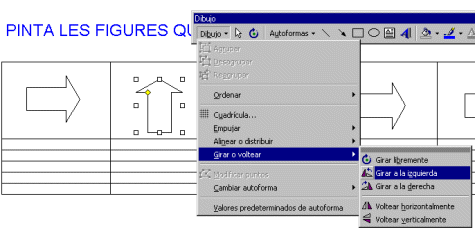 | Seleccioneu, ara, cada una de les fletxes i canvieu l'orientació des del menú Dibujo de la barra d'eines Dibujo, opció Girar o voltear | Girar a la izquierda. La fletxa seleccionada girarà. | ||||||||