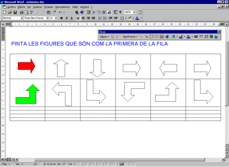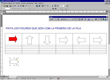 Quan la fletxa quedi amb la mida desitjada, arrossegueu-la fins a la primera cel·la, a dalt i a l'esquerra de la taula. Comprovareu que la cel·la no canvia de mida i és possible que l'autoforma no càpiga dins la cel·la. El motiu és que les autoformes sempre floten sobre el text, també sobre les taules, i cal aconseguir manualment la mida adient de la cel·la que l'ha de contenir. Per tant, situeu el cursor dins la cel·la i feu dos o tres Retorn o salts de línia, amb la tecla de retorn del teclat, fins que veieu que la cel·la és prou gran com per contenir l'autoforma. Ara caldrà modificar l'orientació de la fletxa per posar-la a les altres cel·les de la fila. Per fer-ho, el millor és fer còpies de la primera fletxa, tantes com cel·les té la fila (la primera i cinc més, en aquest cas) i canviar després l'orientació. Feuclic per seleccionar-la i accediu al menú Edición | Copiar i Edición | Pegar |