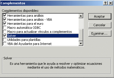 | Si no tenim aquesta eina l'haurem d'instal·lar fent clic a l'opció complementos del mateix menú, i escollint que ens mostri les Herramientas para análisis, i Solver | ||||||||