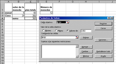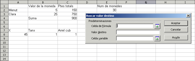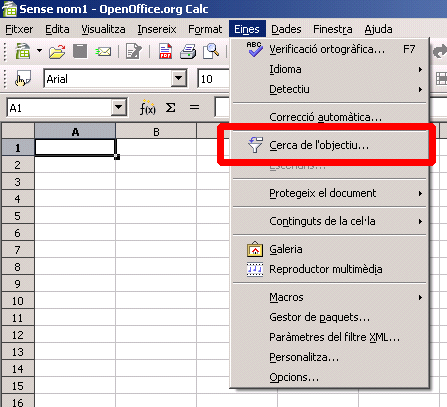 | Amb l'OpenOffice l'eina SOLVER de l'excel s'anomena Cerca de l'objectiu en la versió en català o be Búsqueda del valor destino en la castellana | ||||||||