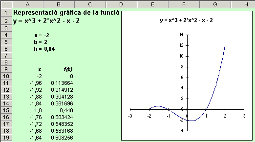 • La funció serà tabulada i representada a l'interval [a,b]: entreu els esmentats valors a les cel·les B4 i B5.