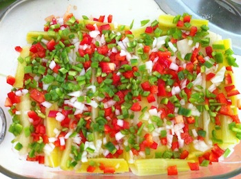 Es fa una vinagreta amb oli, vinagre, sal i pebre, tot ben remenat i després s' afegeix el pebrot verd, vermell i la ceba i es torna a remenar tot.