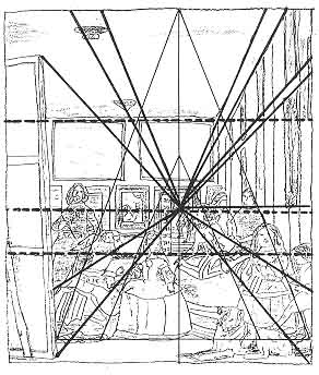103-130): Per mi, el quadre representa la Mirada del Rei, reflectit al mirall; el punt de vista de l'espectador (on s'ajunten totes les línies, al fons) no coincideix amb el mirall però hi és molt a prop i es podria confondre. Es pot pensar que els qui mirem el quadre compartim el lloc del Rei, ens fem com ell. ¿I que mira el Rei? Res important, el treball del seu pintor, Velázquez; però la Mirada del Rei és especial, no és com la de les demes persones: |