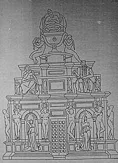 El primer registre exterior està guarnit amb una successió de nínxols, contenint cadascú un grup de la victòria; a les bandes hi havia esclaus lligats a unes cariàtides. Als angles hi havia quatre estàtues: Moisès i St. Pau, la vida activa i la contemplativa.