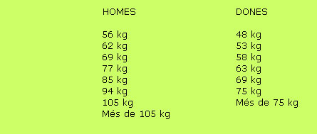 Cada aixecador ha de realitzar la verificació del seu pes mitjançant la pesada. Sense el pes adequat no es pot participar. El pes té una importància cabdal: en cas d’empat entre dos aixecadors, l’aixecador amb menys pes sempre queda per davant en la classificació. Cada categoria es realitza a una competició de final directe. Cada participant té dret a tres intents d’aixecada en les dos modalitats d’aixecada: la arrencada i els dos temps. Amb la suma del millor aixecament de les dos modalitats es confecciona el total olímpic que determina la classificació definitiva: l’anomenat total olímpic. La competició s’inicia amb un pes determinat i es va incrementant progressivament el pes. Els aixecadors demanen els seus intents sobre el pes que ells consideren. |