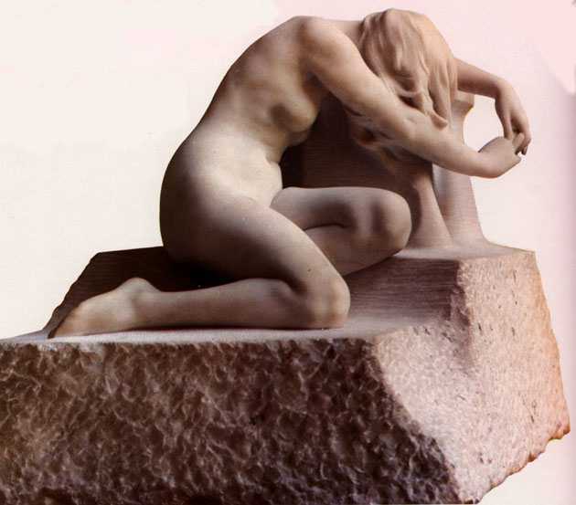 El desnudo permite apreciar toda la serenidad de la talla, la sensibilidad y delicadeza con que es tratado el tema son muy fáciles de apreciar, nada queda oculto, salvo la cara de la protagonista, lo que ayuda a identificarse al espectador con la sensación desesperada de la figura. La nobleza del mármol permite un detallado trabajo de formas y clarooscuro, dejando perfiles completamente libras. Hay una blandura exquisita, que contrasta con la dureza del material. La figura permanece postrada sobre las rodillas y los brazos extendidos, sore el propio núcleo de mármol, es una mujer joven, con el pelo suelto tapando la cara y cayendo sobre los brazos.