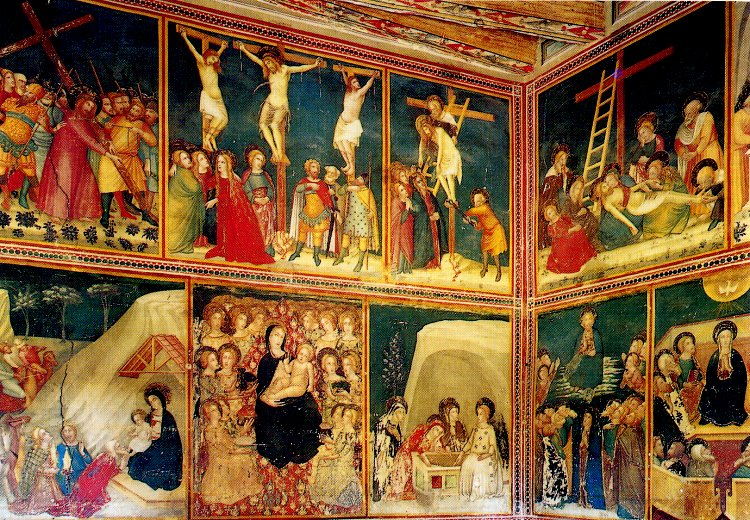 El relat iconogràfic s'estructura en tres parts: el cicle de la Passió de Crist, els Set Goigs de Maria i una col·lecció de retrats de sants. Les vint-i-cinc escenes, que cobreixen els setanta-cinc metres quadrats dels murs de la petita capella d'oració, estan realitzades seguint l'estil de l'escola senesa i presenten algunes innovacions com la combinació de tècniques pictòriques i la incorporació de detalls metàl·lics per ressaltar punts específics de les escenes. Les pintures són un conjunt extraordinari i un testimoni excepcional dins el panorama de la pintura gòtica catalana.