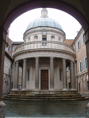 Sant Pietro in Montorio és un temple erigit en el lloc en el qual, segons la tradició, havia estat crucificat Sant Pere. Bramante a més va veure en la forma circular la millor expressió de la racionalitat renaixentista. En el seu projecte, aquest petit temple se situava en el centre d'un claustre circular, envoltat de columnes, que després no va ser construït. La tipologia circular correspon a la creença que afirmava que a Déu li correspon la forma geomètrica més perfecta: l’esfera. La cúpula simbolitza el trànsit del món terrenal al celestial.