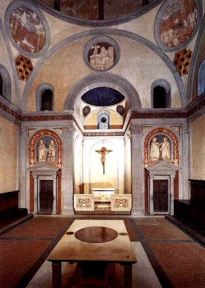 Juan de Médicis decideix encarregar el projecte a Brunelleschi amb una clara finalitat: el temple hauria de servir com a panteó dels membres més il·lustres de la família, per a mostrar al món no sols la riquesa familiar, sinó també el seu predomini en la vida política i cultural de la capital toscana. |