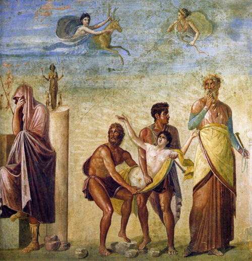 A aquest últim correspon El Sacrifici d'Ifigenia, gust per l'arquitectura teatral, amb escenes mitològiques. Aquesta obra, datada cap a l'any 62 d. C., es trobava en el pòrtic del peristil de la domus del Poeta Tràgic, avui en el Museu Nacional d'Arqueologia de Nàpols. Es creu que és una rèplica d'una pintura original de Timantes, s. IV A. c. que era deixeble de Parrasio.