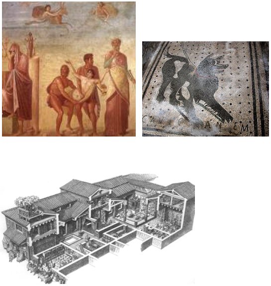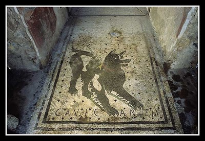 En la domus del Poeta Tràgic es representa un mosaic d'estil hel·lenístic a l'entrada, un gos subjecte amb una cadena, amb una inscripció “Cavi C Canem”. Ave, salutació, C, cova i canem, tenir cura, es podria traduir com “ Et saludo a casa meva, cura amb el gos”. |